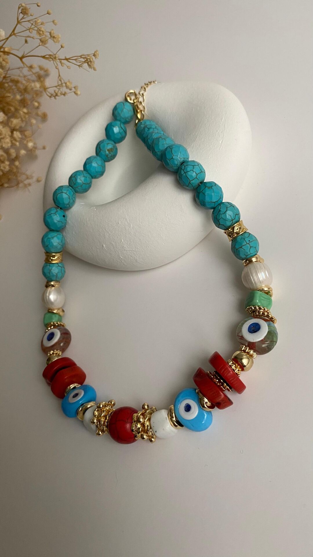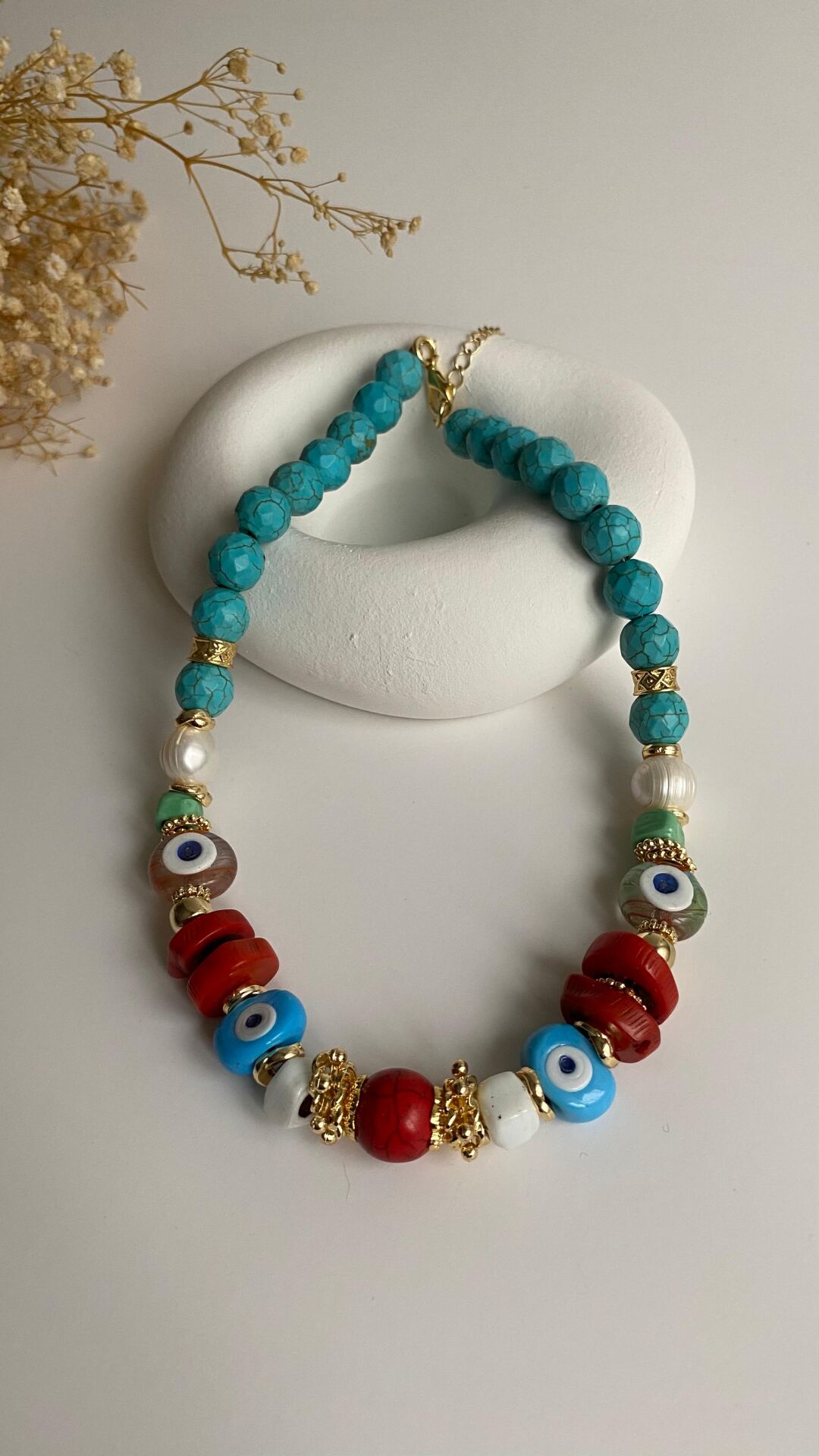 Turkuaz,mercan sedef nazar boncuklu kolye
